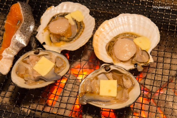 While researching this trip, we kept coming across photos of grilled scallops. Our first encounter with this delicacy was served with a thick pat of rich Hokkaido butter. It was fun grilling these shellfish right at our table. When the butter is melted and not a second longer, the clams and scallops are ready. Add a splash of soy sauce… or not.
