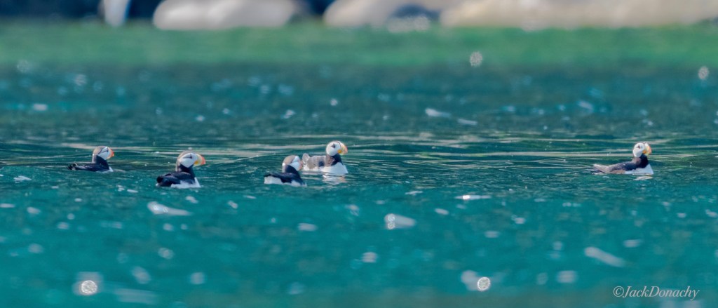In flight, they skim the seas like some form of exotic bee, chunky dark bodies pulled along by those wonderfully colorful bills, determined wings rapidly beating the air into submission. Suddenly they glide upward along the face of a rocky headland and unerringly disappear into a crevice where a chick or mate is waiting. Over and over they repeat the circuit – the flight out, the deep dives, the return flight – until one day they gather their forces and all the puffins and perhaps other nearby nesters as well head en masse out to sea where they will spend the winter months. Juveniles, no longer under the care of their parents, will struggle at first to tag along, often not making it far before they need a rest. And then, they too will find themselves over the sea’s depths. For the youngsters, it will be two years before they return to their natal headlands or island. But the adults return each year, finding familiar ledges and spaces between rocks, watching over a single egg, and joining other puffins, murres, auklets and guillemots over shoals of herring, sand lances and out-migrating salmon smolts. It is an amazing sight to behold.