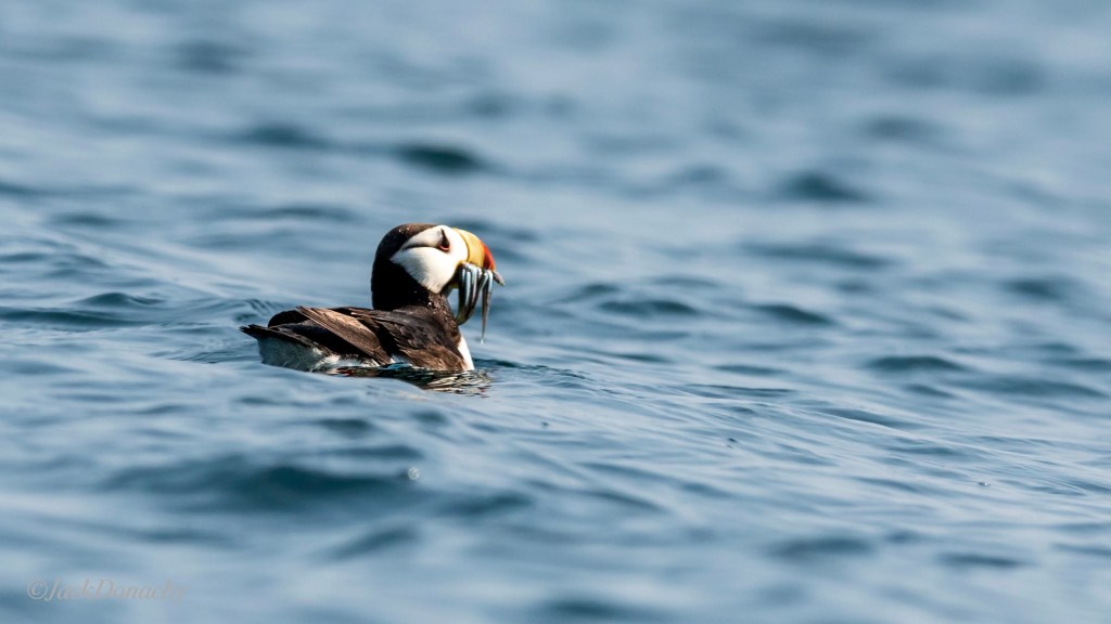 It is reported that a Horned Puffin can carry dozens of small fish in its bill. I counted eight sand lances here. (Alaska Gulf near Chignik, July 28, 2020,)