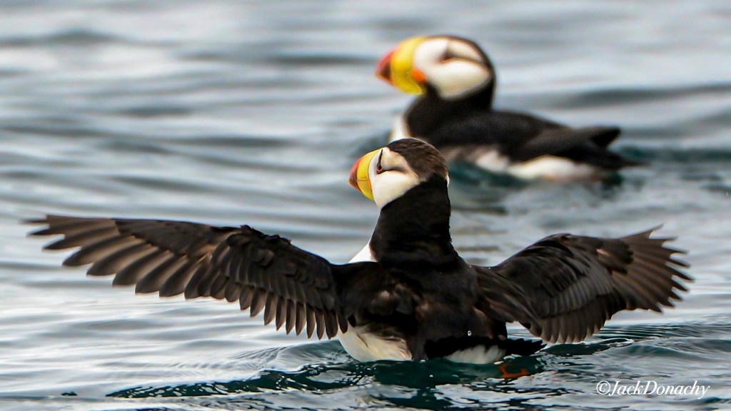Horned Puffins, so named for a small, fleshy point protruding above each eye (see the first photo in this article) are easily distinguished from Tufted Puffins, above. Both species are present in the Alaska Gulf near Chignik.