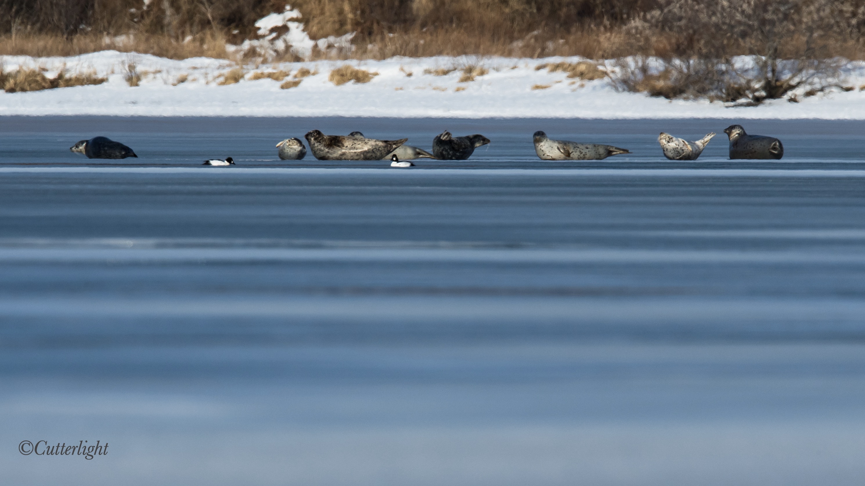 There always seem to be at least a few Harbor Seals somewhere in the freshwater lakes and river of the Chignik System. Here, a group haul out on ice to catch some rays. Events such as this are no doubt of great interest to the area’s wolves, as occasionally the pinnipeds get trapped on solid ice with no escape route. The foreground birds are male Common Goldeneyes – menaces in their own right to local sculpin and stickleback populations. (February 3, 2017)
