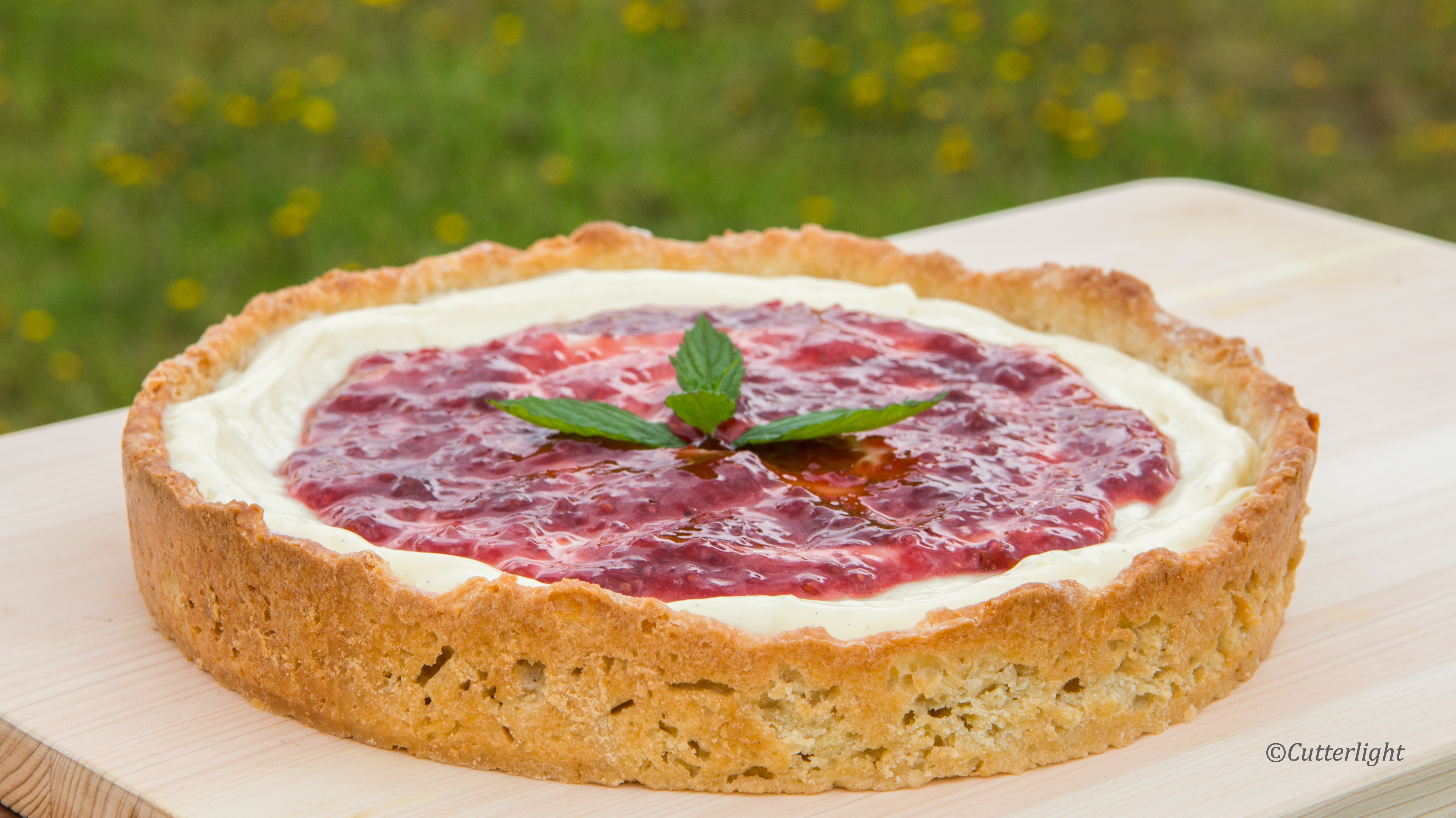 A crust infused with almonds. Then a creamy vanilla custard topped with a smooth, delicious layer of homemade jam – I prefer raspberry. I set it out to photograph, and it was gone in a flash.