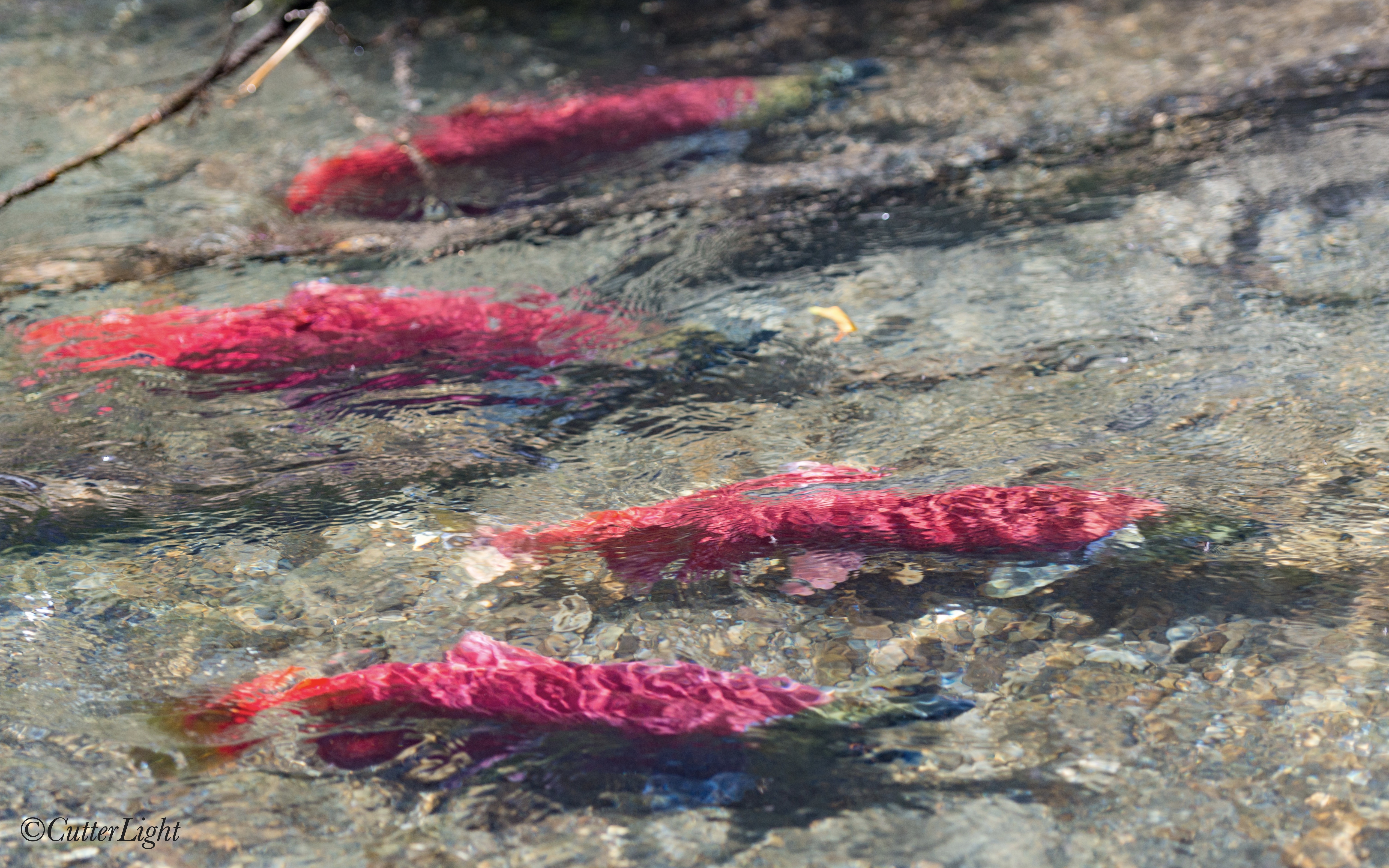Seeing young salmon along the lake shore and in the several small creeks feeding in the lake always puts a lightness in our hearts. Sockeyes and Coho and lots of them. When a midge hatch is on, the surface of the lake becomes dimpled as though rain is falling as these fish rise to intercept the insects. When I turned over a few rocks in one of the streams, to my surprise I found the undersides to be thick with mayfly nymphs. There were also a few stoneflies, which equally surprised me. In late summer we’ve been here for the heaviest midge hatches we’ve ever witnessed, but other than sporadic hatches of caddisflies we haven’t noticed much else, a very occasional stonefly and a few small mayflies notwithstanding. The undersides of lake rocks can be thick with caddis cases, so there must be significant hatches of those at some point. And if the feeder streams are home to mayflies, maybe we’ll be around for a hatch of those. There’s always something new to look forward to.