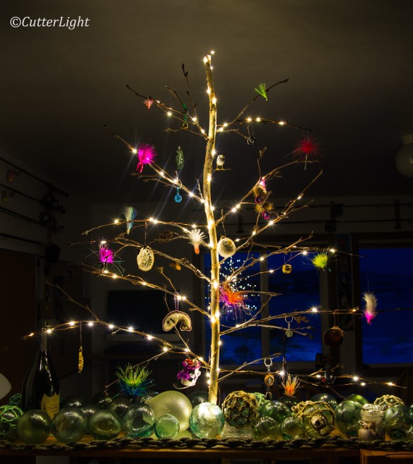 An assortment of seashells, brass bells (presented to us for good luck), tiny decorative birds and carved wooden trout we’d collected on our recent bike trek in Hokkaido were rounded out with some of our more colorful salmon fishing flies. We placed our collection of Japanese glass fishing floats beneath the boughs along with a decorative lamp made from recycled glass we also sent back from Hokkaido. Two strings of fairy lights competed the decorations.