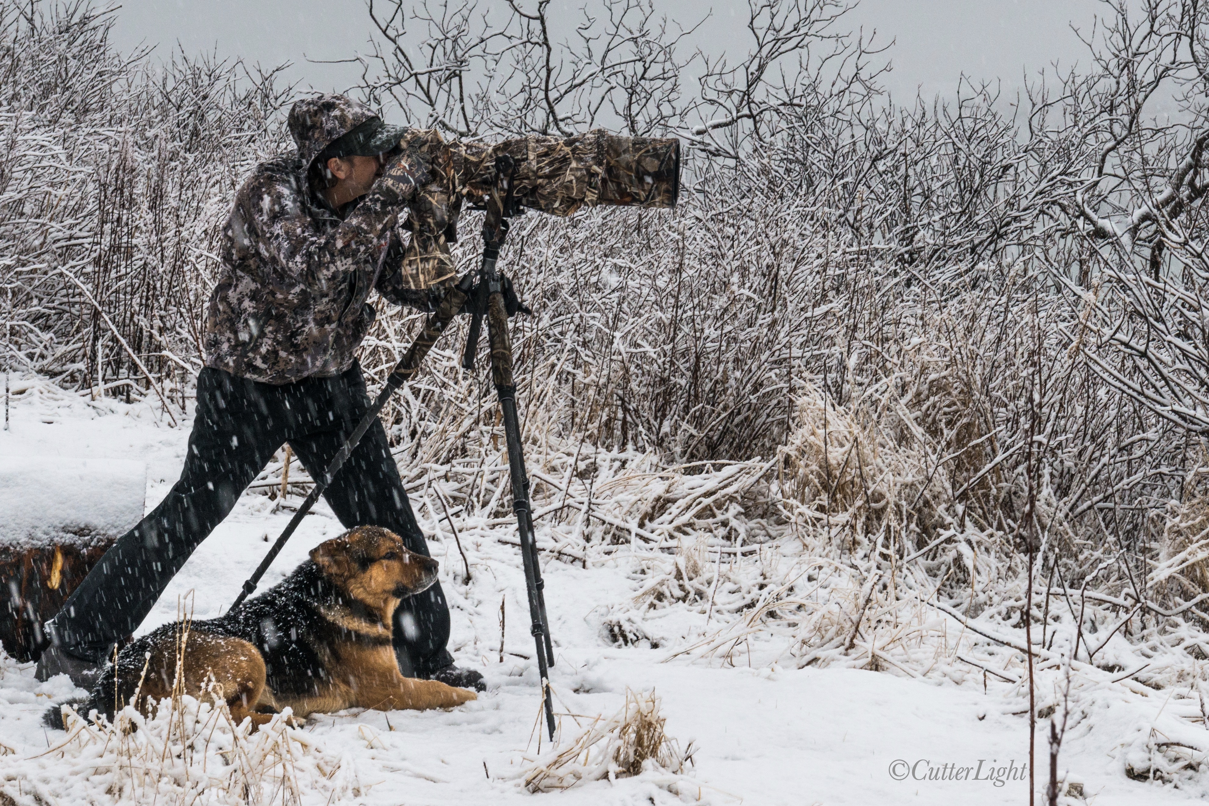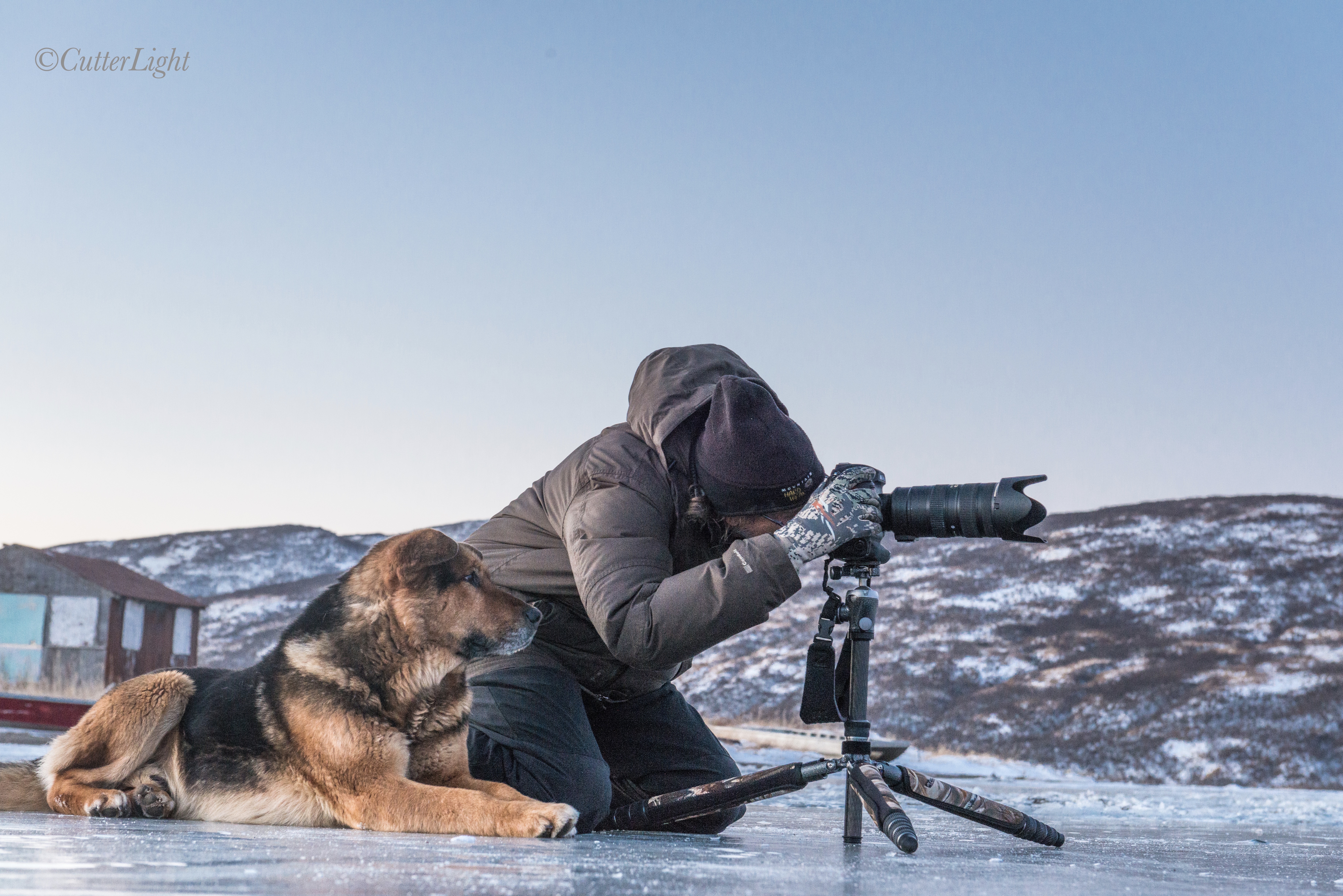Even without the incentive of food, Buster began hanging out with us. On my daily birding walks, I could usually count on him to show up, seemingly out of nowhere, and falling into step. It seemed that he recognized the cadence of my stride and, as sometimes happens between two beings, that he’d taken a liking to me. When I arrived at wherever I was going to set up my tripod and camera for the morning – looking for ducks out on the river or lake, or songbirds at the White Spruce Grove – he’d position himself as closely to me as he reasonably could and then quietly, patiently and faithful watch alongside. Buster loved to be petted, and he had an endearing habit of pushing his head into my leg to remind me how much he loved being petted. For my part I couldn’t have asked for a better fellow birder. He had the capacity to remain still for a very long time and his alertness probably helped keep me more watchful. And so we spent mornings like that, enjoying sunshine, enduring rain and snow, staying low against the wind, documenting birds that in some instances had never before been recorded on this remote peninsula.