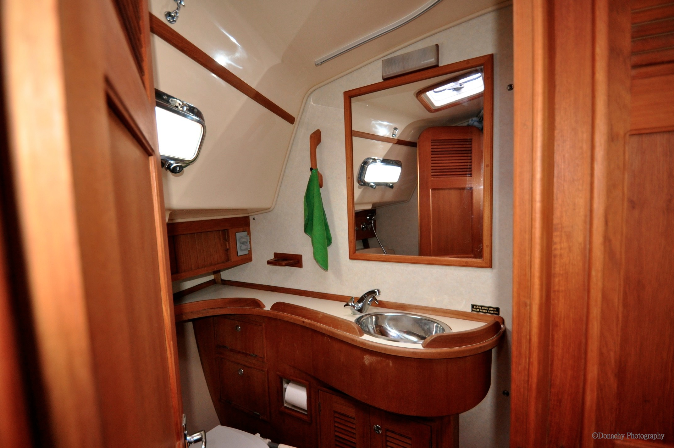 Bandon’s head has a porthole and skylight for plenty of natural lighting, and there’s ample elbow room. Forward (to the left) is a shower head. Separate doors alow for access from both the forward stateroom and the main salon.