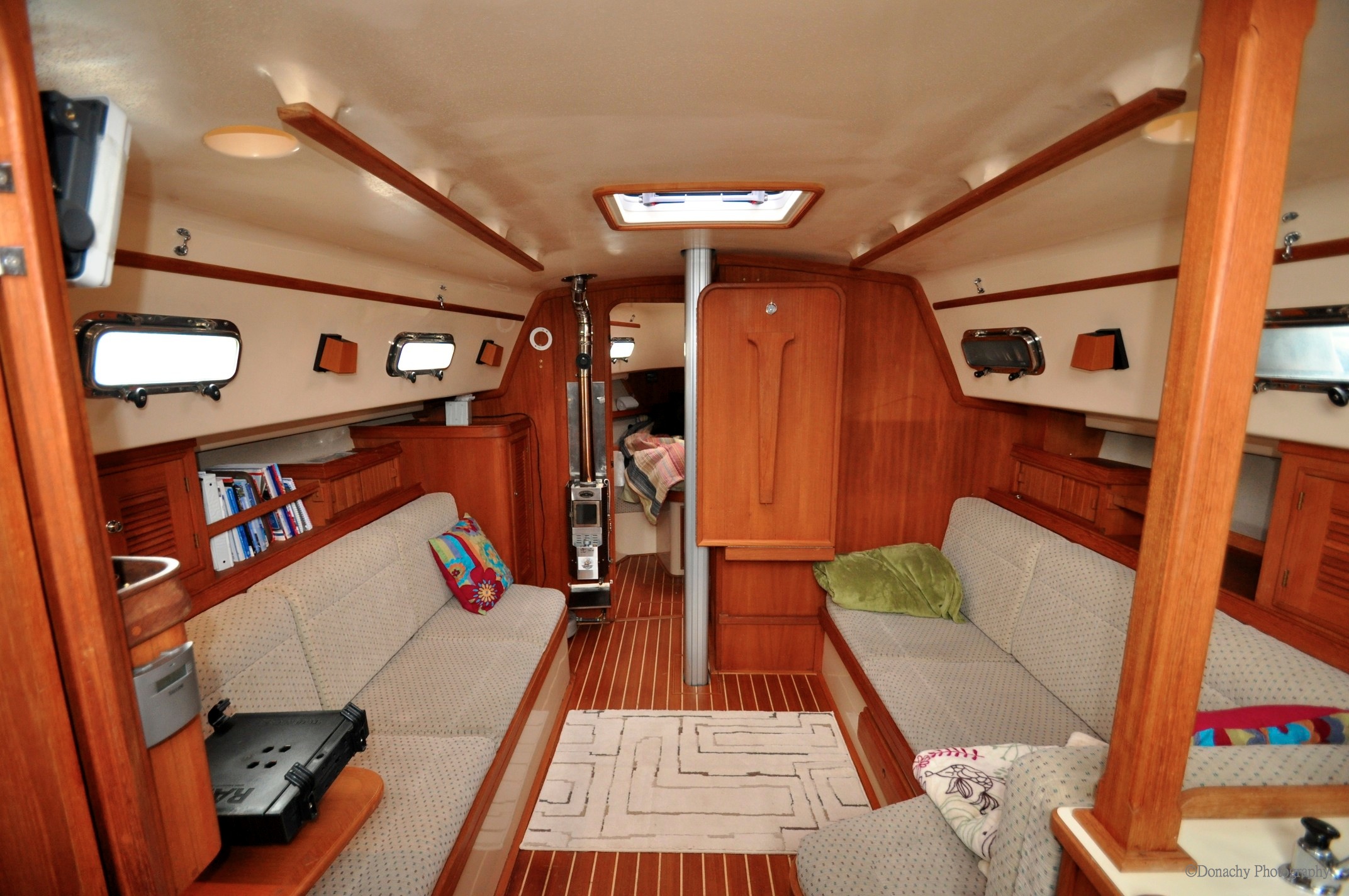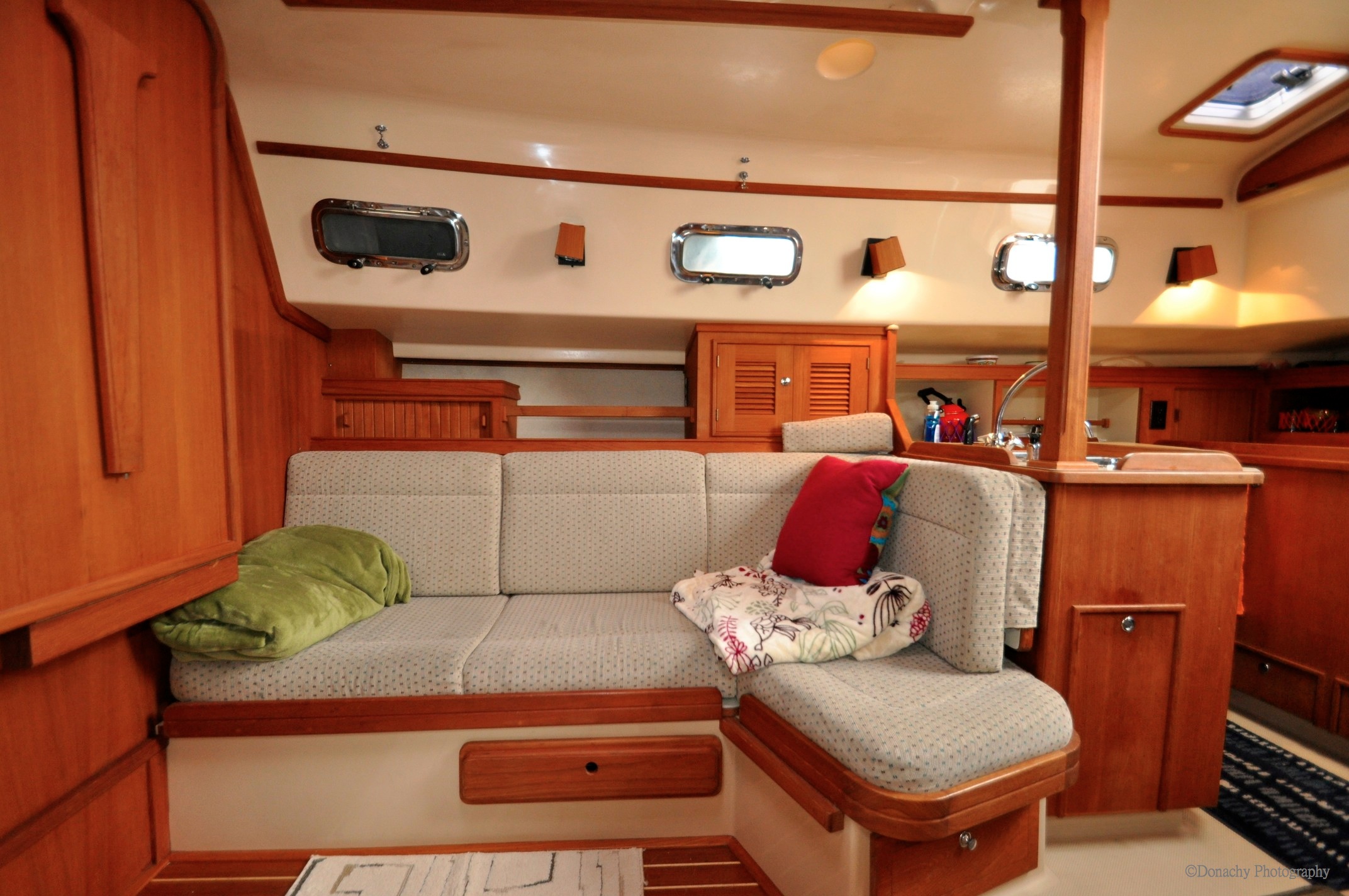 Below and behind the cushions of this settee is tons of storage space. The settee itself can be reconfigured to make a comfortable twin-sized bed. Aft of the settee (to the right) is a U-shaped galley complete with double basin sink, two burner stove, a deep cooler, and more storage space.