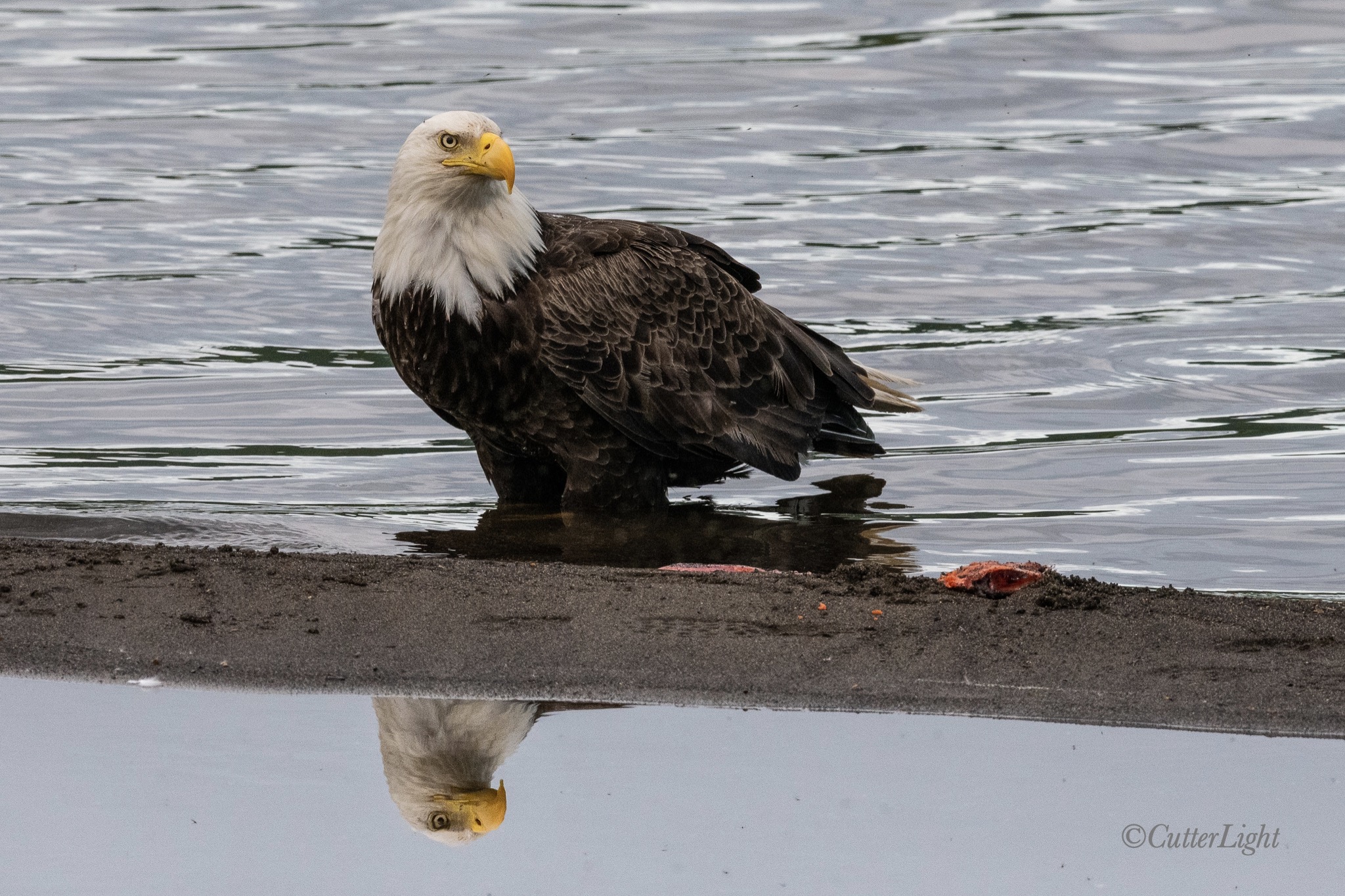 This mature bald eagle has been coming around to fill up on salmon scraps left on the beach. One of the things we’ve most enjoyed about our life at The Lake has been the live and let live attitude toward wildlife that generally prevails. A few moose and an occasional caribou are taken, but no one begrudges our eagles, bears and foxes what’s leftover after the salmon have been split for smoking and canning.