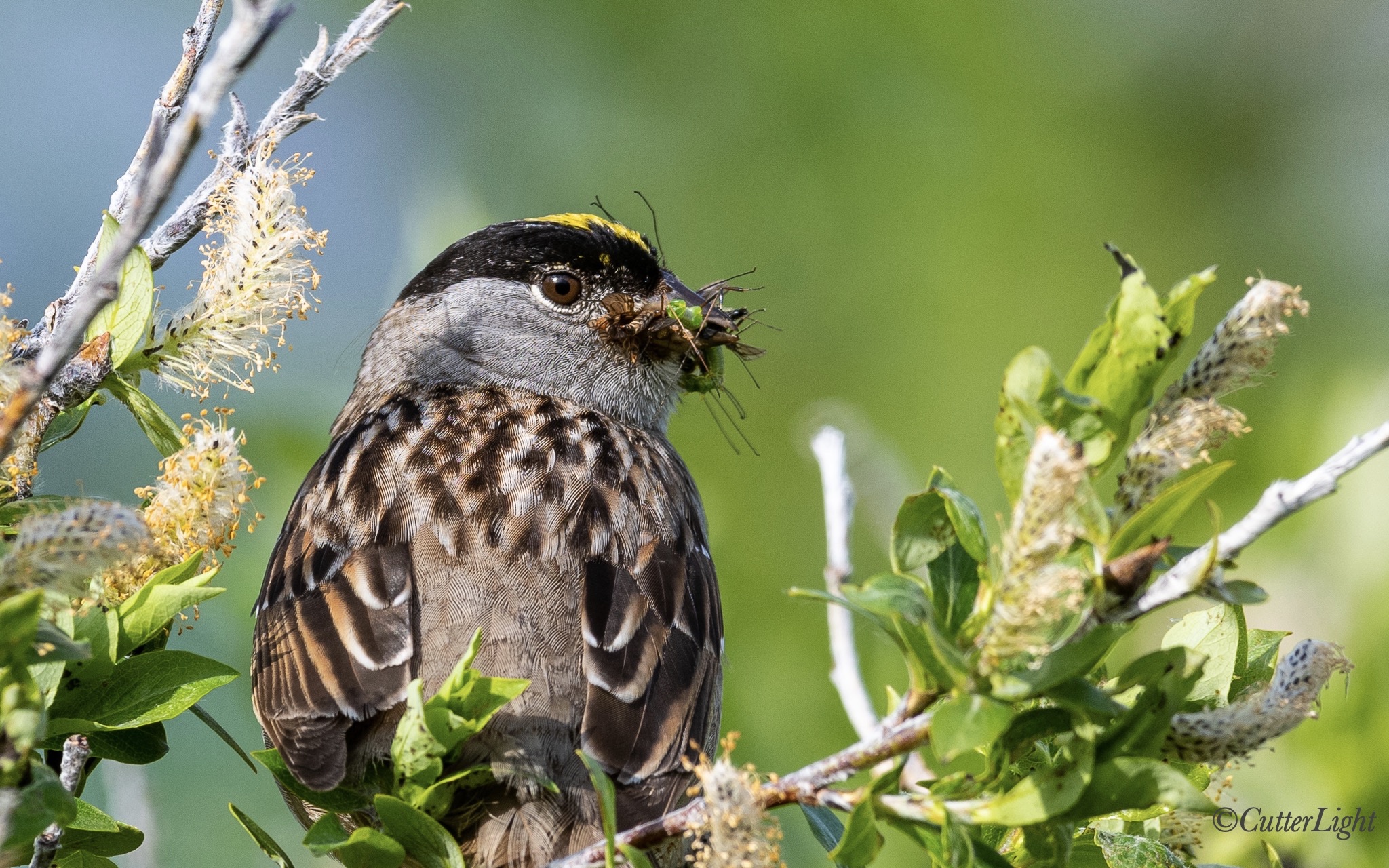 A pair of Golden-crowned Sparrows nested beneath a willow thicket right next to our home, and although we’ve heard the young ones chirping for food, we’ve never bothered to look too closely for the nest for fear of leading Magpies to the location. Keeping the little ones fed appears to be a full-time job. I got this photo yesterday morning.