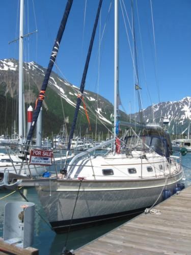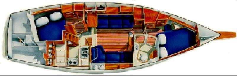 Below and behind the cushions of this settee is tons of storage space. The settee itself can be reconfigured to make a comfortable twin-sized bed. Aft of the settee (to the right) is a U-shaped galley complete with double basin sink, two burner stove, a deep cooler, and more storage space.