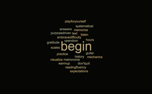 Begin. This first step may seem too obvious. It’s not. We Baby Boomers have known about guitars most of our lives. We were playing air guitars by the time we were eight. Maybe like me, you’ve owned a guitar in the past and even taken a couple of lessons. And then quit. For some reason you’ve put off getting serious about learning to play a guitar for 50 years or more. Part of your journey might be understanding what has blocked you in the past – what was in the way.