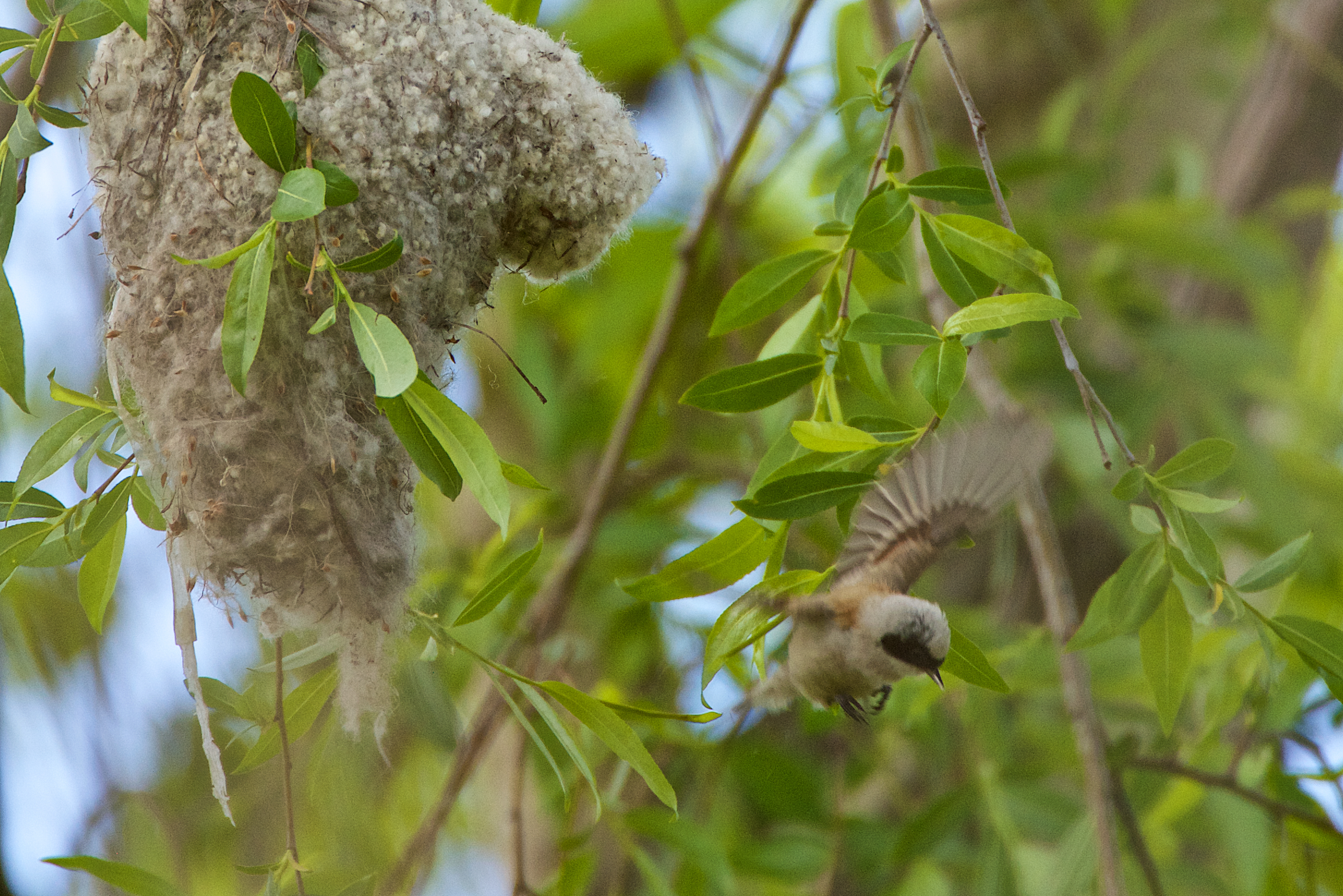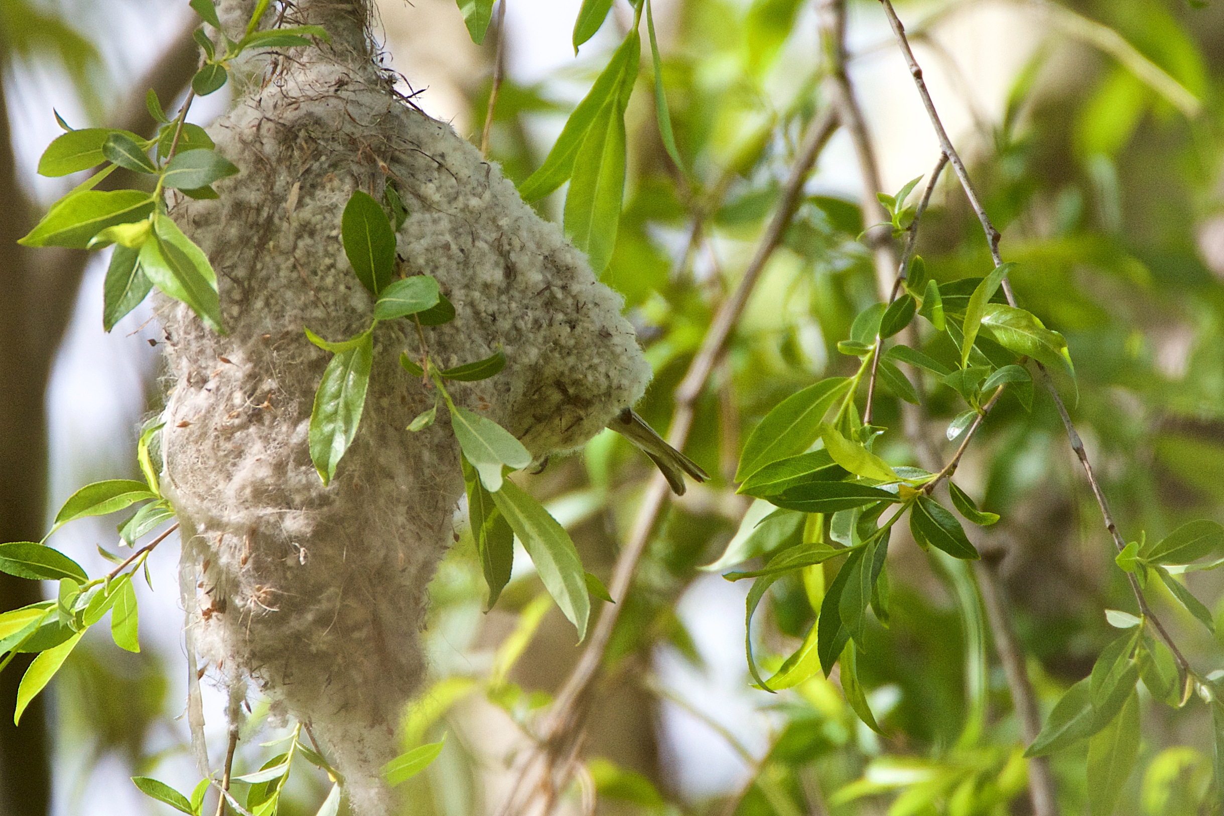 Cottony-soft and virtually impervious to rain and predators, these tough, tightly-woven nests were used as children’s slippers in Europe in the past. The Masai of Africa used those of a related species as purses. This one was swaying and rocking in the fresh spring breezes.
