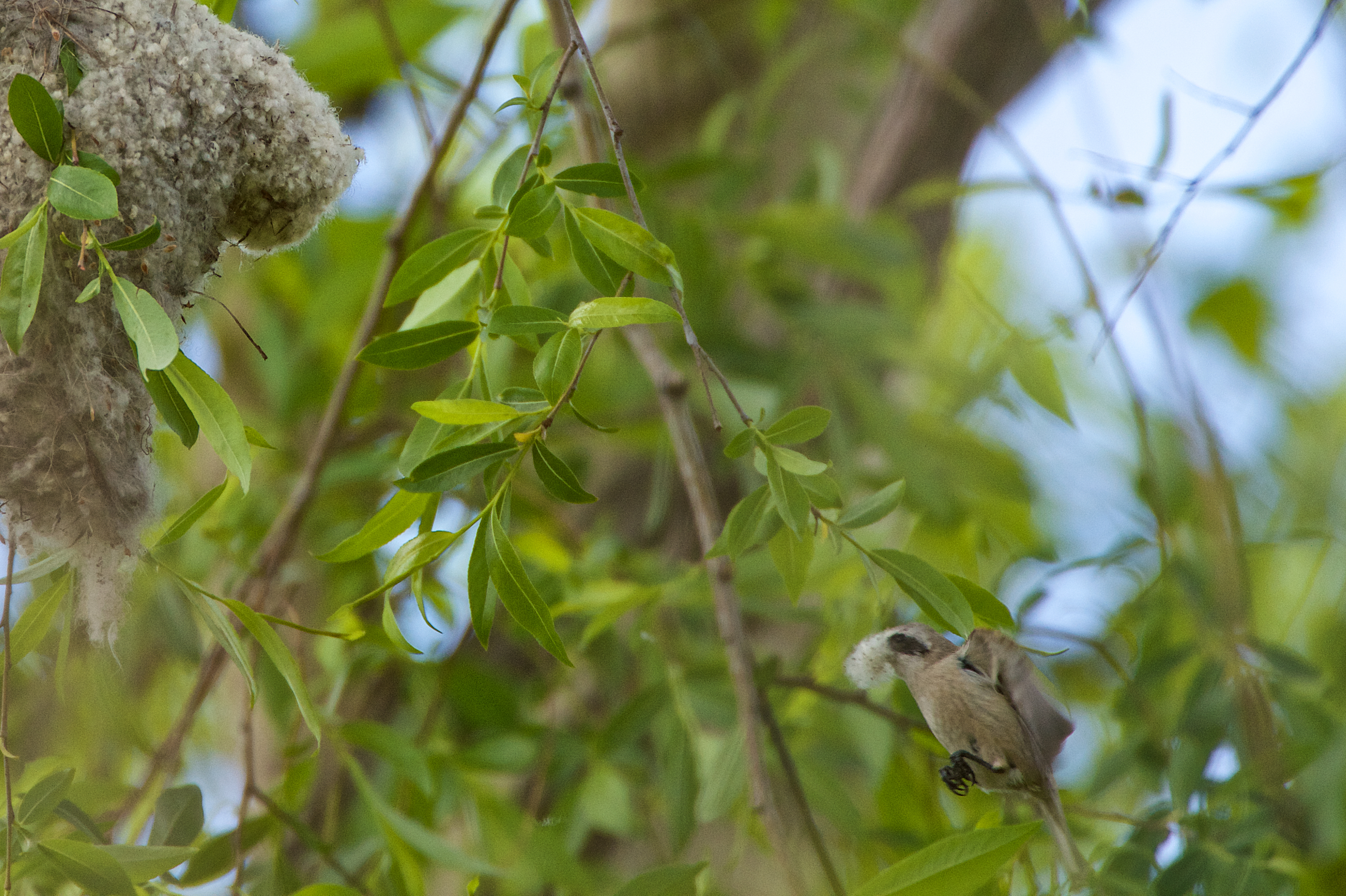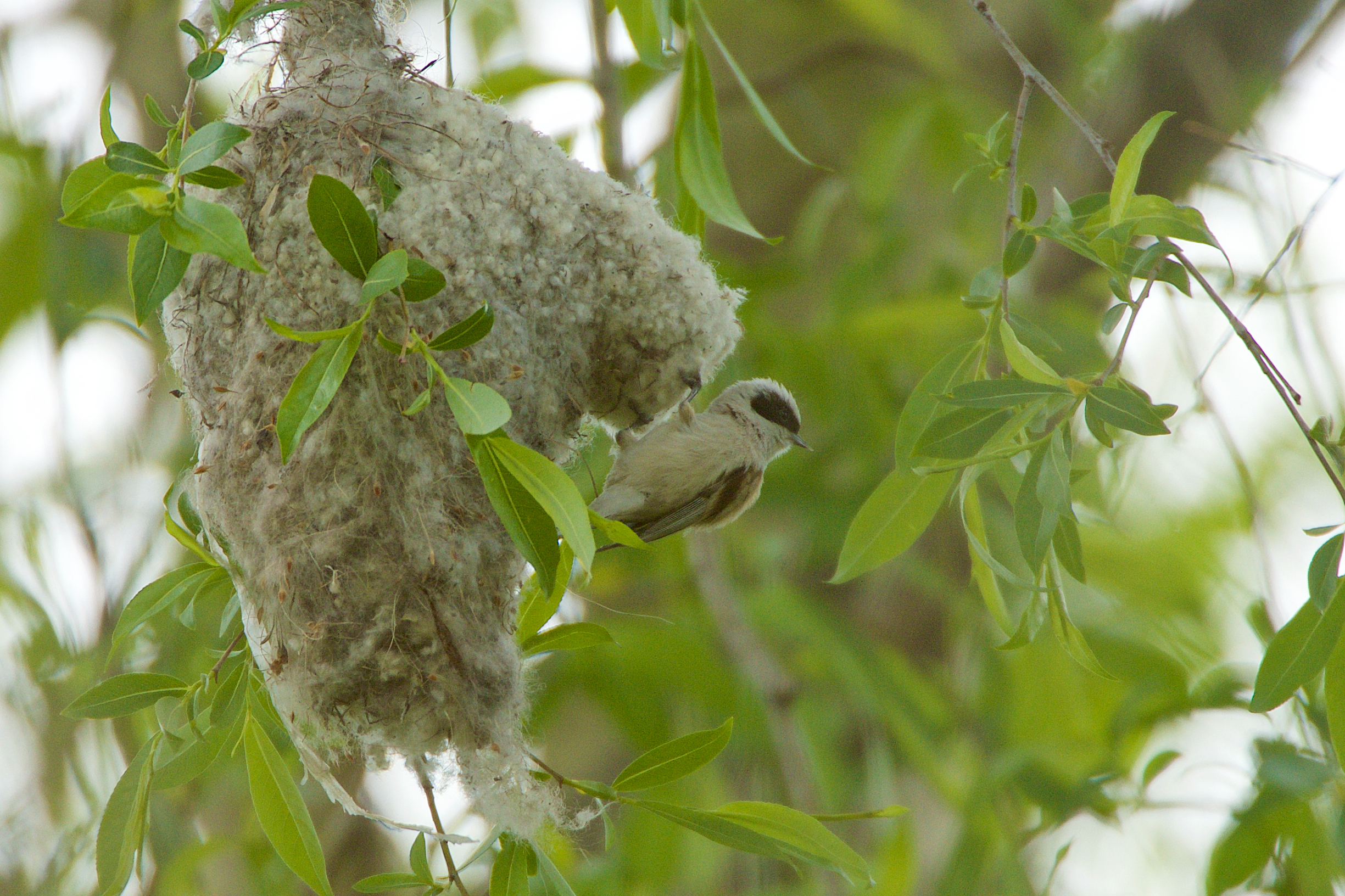 I knew that finding the bird was no guarantee I’d find his nest, but using clues from the nests we’d stumbled upon over the winter, I located the same sort of tree in the same sort of setting, looked carefully among the boughs about 17 feet up, and there it was, hidden in plain view. Penduline tits do not reuse their nests, but they do seek out the same habitat year after year.
