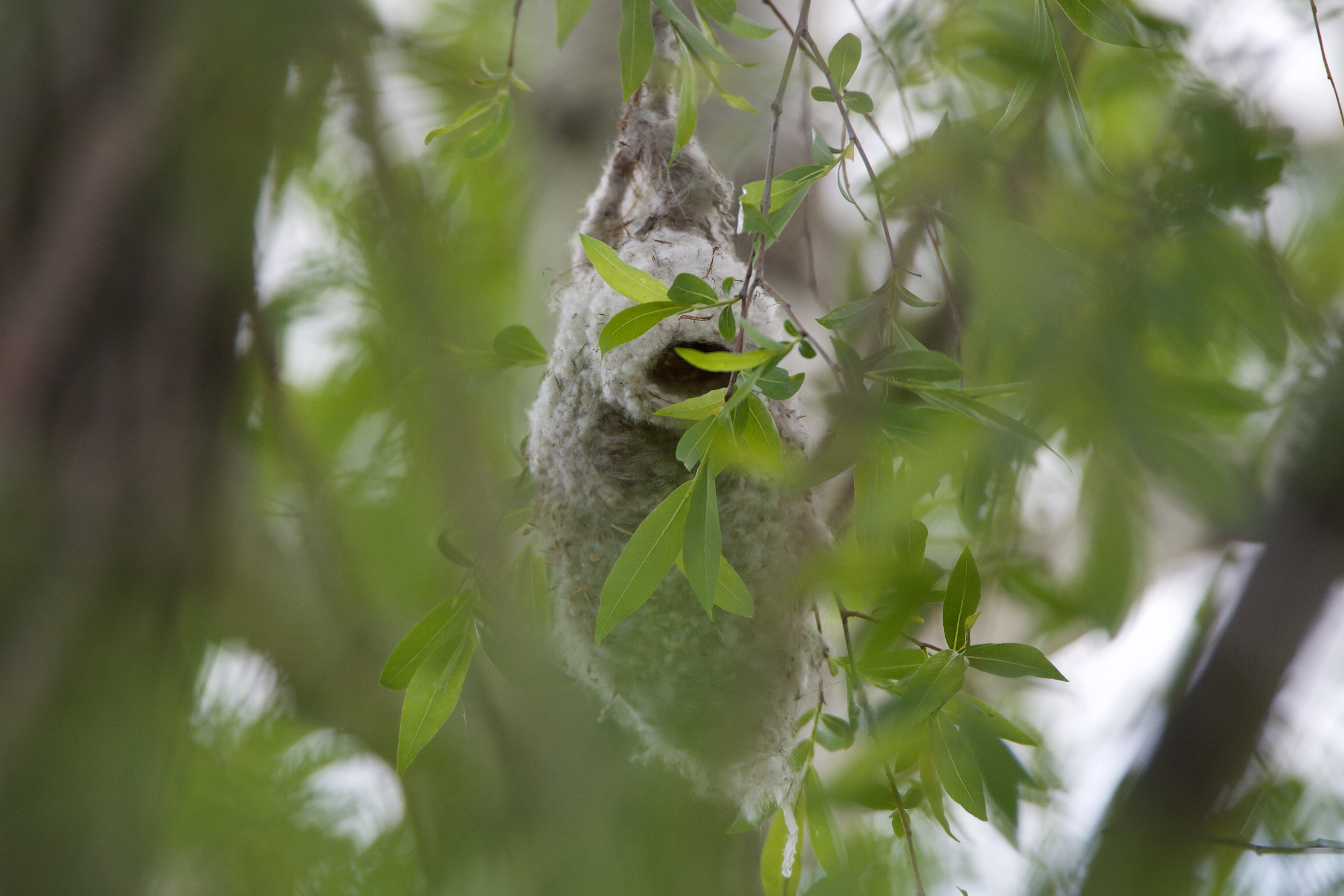 There was cloud cover off and on, it was getting late in the day, and the light was all wrong to shoot the nest from the front, so I moved to the side. I was concerned about spooking him off his nest (the males do most of the building), so I kept a distance and tucked in behind some small willows.