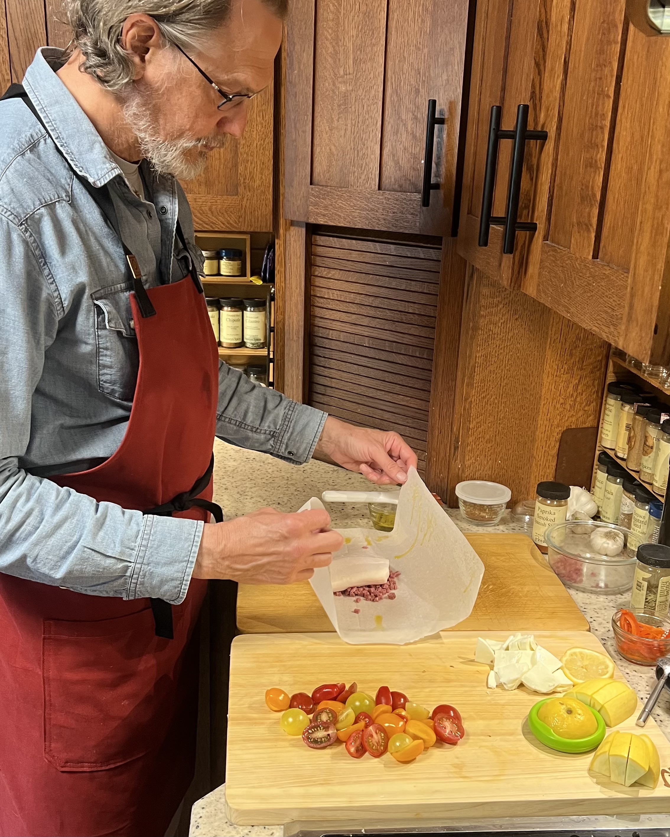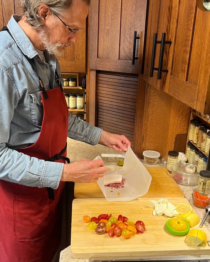 Chef Jack doing his magic. Preparing halibut on a bed of chopped venison sausage to be grilled en papillote. So grateful for the kindness of sharing neighbors.