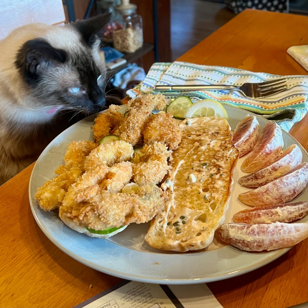 This sandwich kicks it up – and no one was in trouble! Fried oysters, fried shrimp, and fried yelloweye rockfish atop sunomono cucumbers served on a toasted tartar slathered bun. The combination of the fat of the fried food and the acid on the cucumber salad was perfection. What in the world shall we call this one? Ideas?