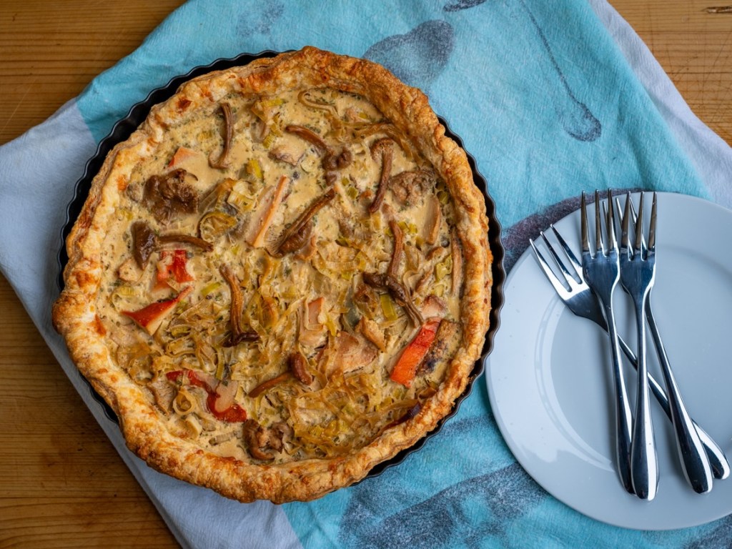 Fall forest walks are full of fantastic foraging. At the end of a lovely walk, we came home with a basket of hedgehog and yellowfoot chanterelle mushrooms – perfect for a wild mushroom quiche. We added in a few sulphur shelf mushrooms from the freezer to make an extra wild recipe. The mushrooms were mixed with sautéed leeks and shallots, and the usual cream and eggs. The filling was baked in a smoked gouda pastry crust. It could be a perfect centerpiece to a champagne brunch, or a decadent dinner aside a wild foraged salad. Bon appetit!