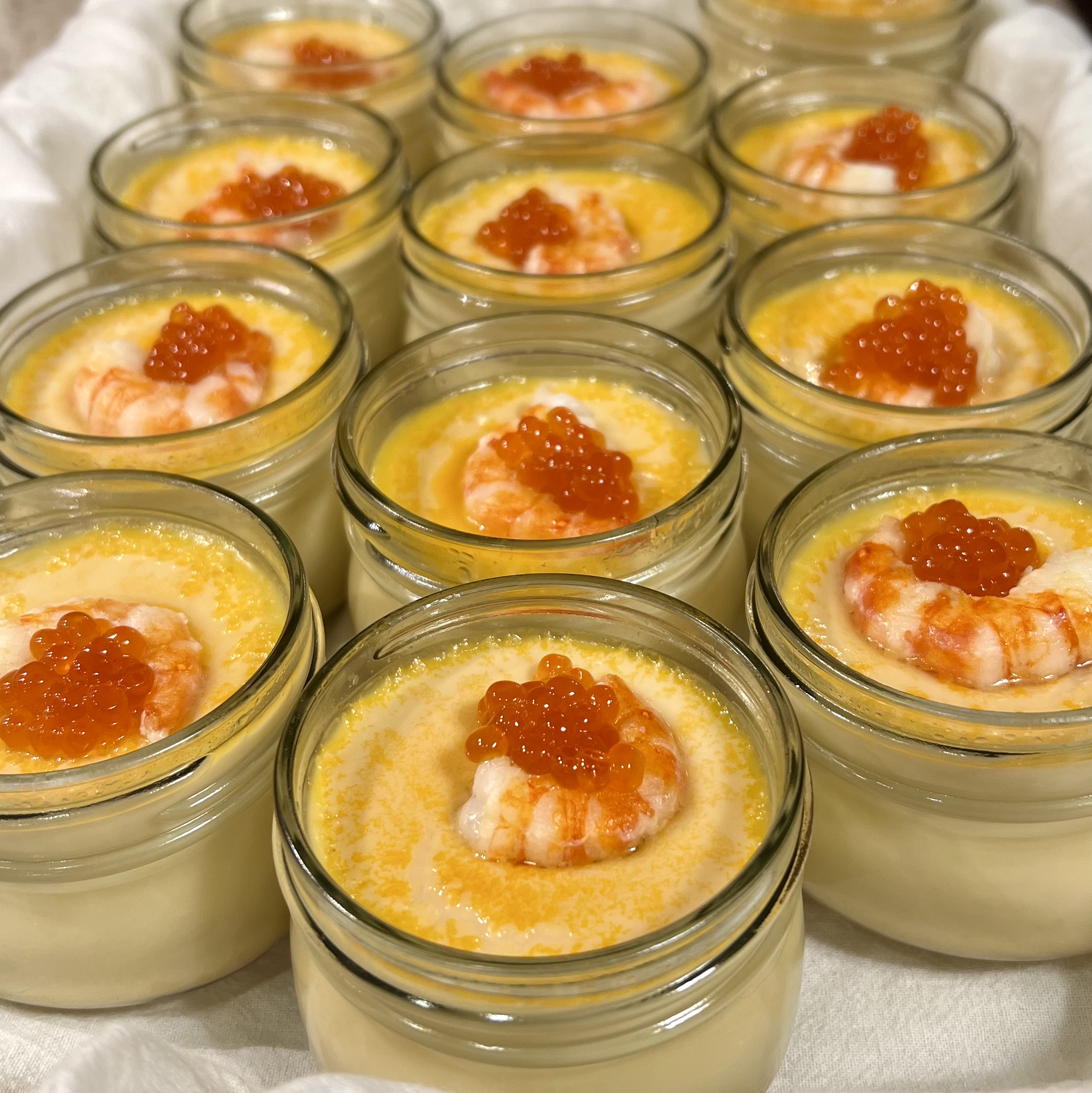 One of the most delightful things about this savory, silky custard-like soup is the surprise at the bottom. This version of a favorite soup lured you in with toppings of sweet spot shrimp fished from nearby waters and salmon roe ikura. Once you spooned your way through all that deliciousness, you would have been surprised by a nice bite of smoked salmon at the bottom of the bowl. In order to make this first course easy to transport to a Thanksgiving potluck, we made them in four-ounce canning jars. They were cooked bain marie, instead of the traditional steaming, which worked quite well.