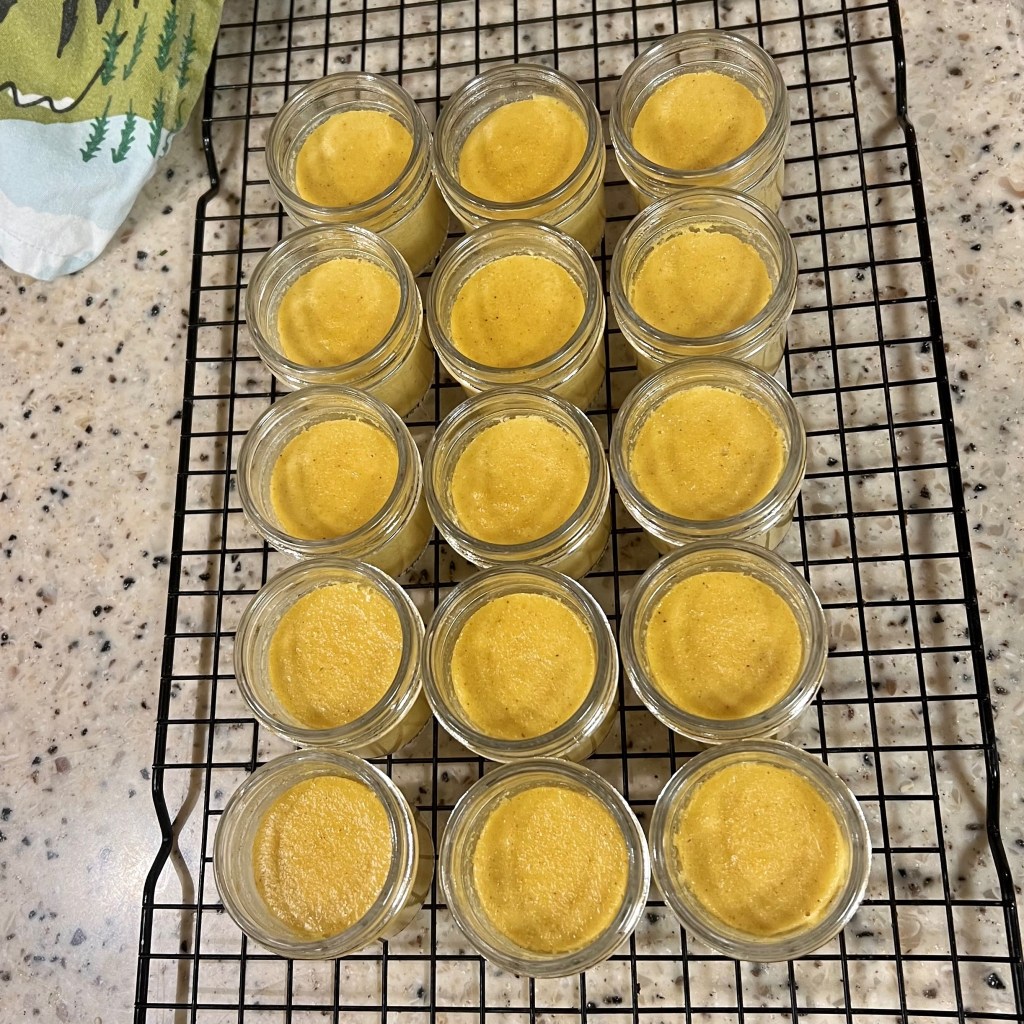 These little custards were baked in two-ounce canning jars and are awaiting the finishing touch of a caramelized top. They are the perfect size for a dessert bite at a potluck.