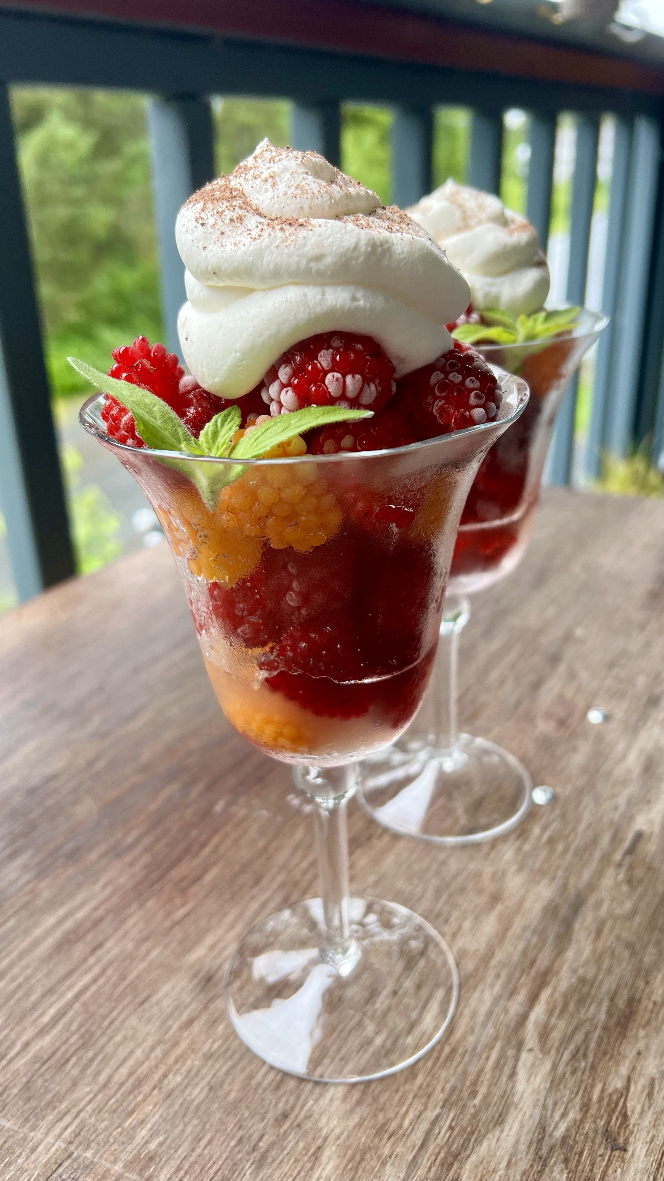 Light and creamy vanilla cheesecake drizzled flooded with wineberry syrup. Just building the anticipation for berry-picking season.