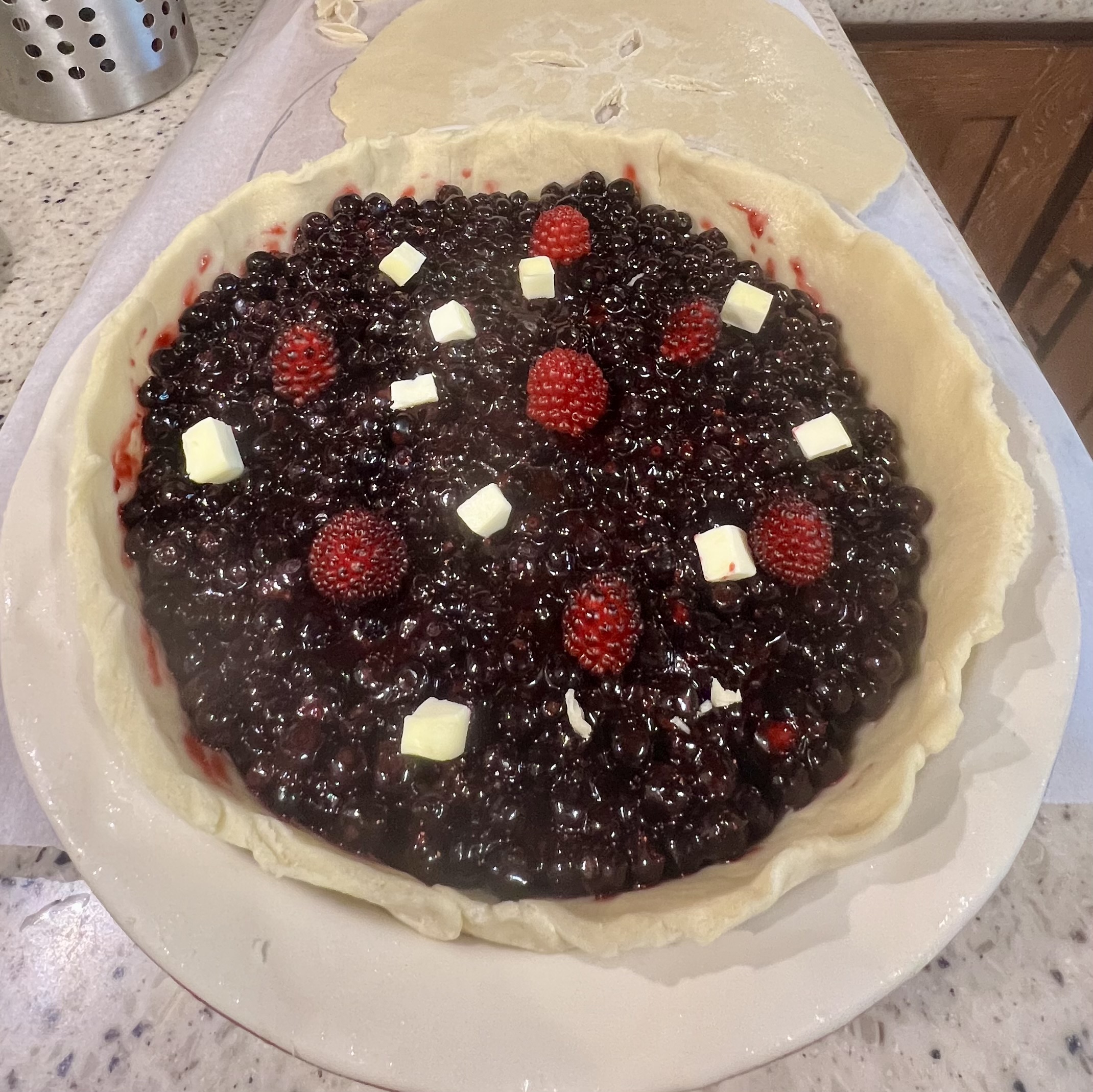 The deal is “you pick me 5 cups of berries and I’ll make you a pie.” We stumbled onto a blueberry bush Loaded with berries. In no time at all, we had 5 cups in the bag. Seems like all agreed, it turned out pretty fantastic.