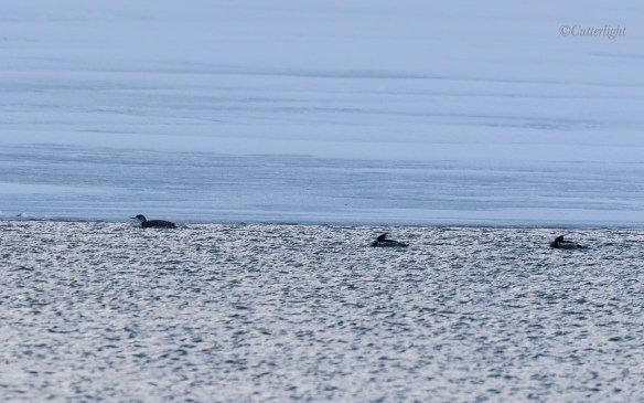 Fine and far off. In fly-fishing, the phrase refers to light tippets and long casts to wary trout. Here it refers to my lone Red-throated Loon sighting on Chignik Lake. It’s difficult to see the eponymous star-like speckling on its back in this photo, but a fine bill angled up slightly, a face showing more white than in other loons, and a smaller, more rounded overall profile add up to Red-throated. A pair of male Red-breasted Mergansers nap to the right on an icy Chignik Lake. (April 1, 2017)