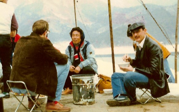 Enjoying piping hot noodles and charcoal-broiled smelt with Cass on an iced-over lake near Mt. Fuji, c. 1983