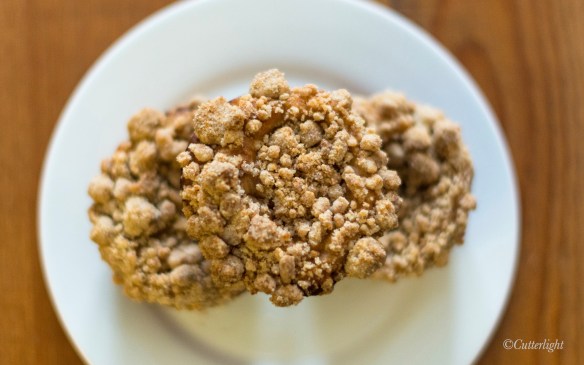 A friend asked to trade some freshly laid eggs for some baked goods. With no dietary restrictions and no allergies I had a blank slate in front of me. I flipped through my mental recipe book of favorites. What a fun task! I visualized braided bread, focaccia, soft pretzels. Then I switched to sweets – mocha bars, monster cookies, blueberry pie. Last summer’s many warm and sunny harvesting days yielded gallons of berries and stalks upon stalks of rhubarb. I had made rhubarb sauce that went so well dolloped on warm brie cheese. I still have a few jars left of this concoction. With the snow falling outside, I thought the ideal baked good should conjure summer days. It was decided – rhubarb muffins. I thought a crumble crown would jazz up a potentially plain looking muffin. A bit of ginger and cinnamon added to the crumble finished out the flavor ensemble. The finished product came out moist and flavorful. A fresh cup of french roast, a rhubarb muffin and a fried egg – now that’s a warm and cozy breakfast!