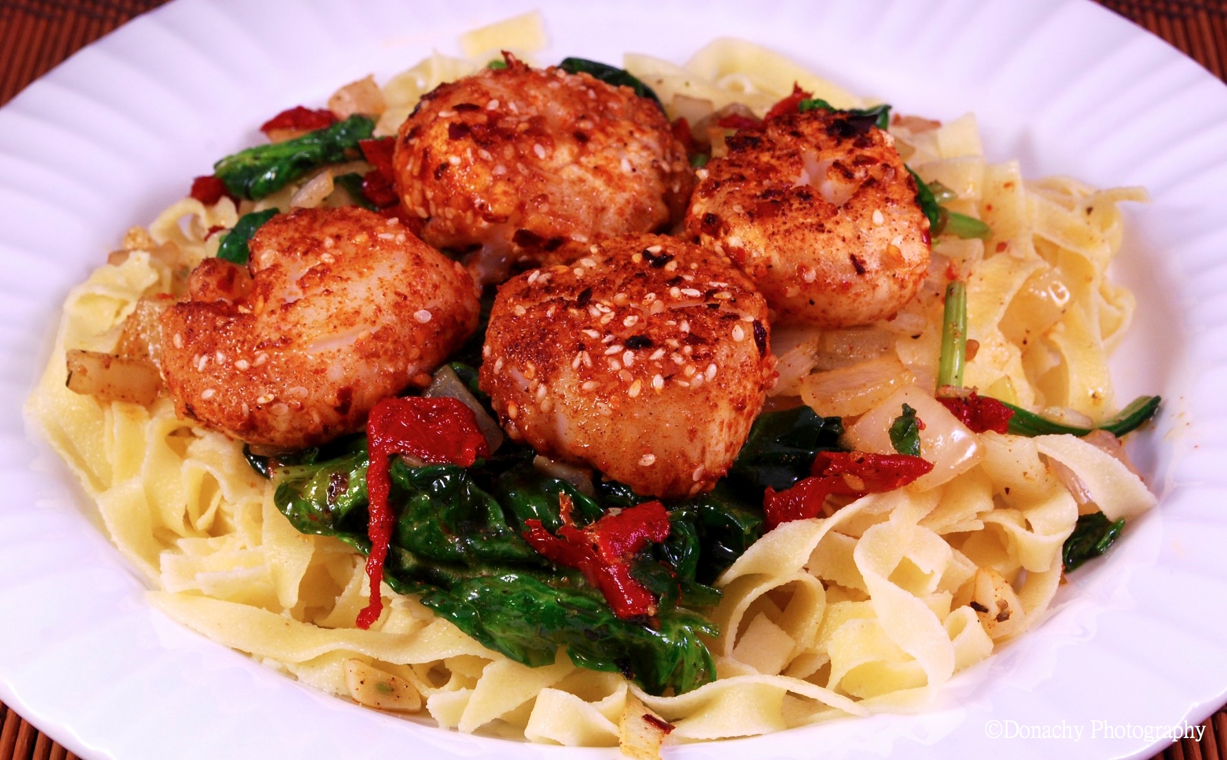 In this dish, I’ve added chopped sweet onion, tomatoes and three kinds of seafood to the olive oil and garlic. Tarragon, sea salt and freshly cracked pepper flavor the seafood. When I lived in South Carolina, I used to make this dish with white shrimp which I was able to cast a net for, and instead of salmon, I used freshly caught striped bass or pompano.