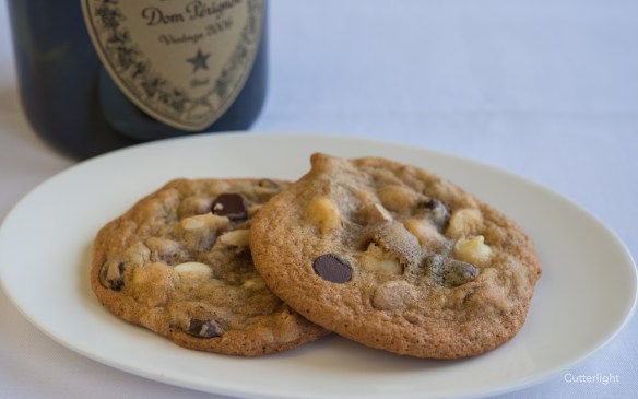 Using the concepts from the article – ingredients should be top notch and the cookie needs to be served individually-baked and warm – I created my own version of a cookie that would deserve an $8 price tag. I love the flavor and texture of nuts in my chocolate chip cookies, so I browned the butter and toasted some chopped almonds to ensure plenty of nutty flavor. I added a dash of almond extract for additional flavor. Traditional chocolate chip cookies use vanilla extract. I substituted the extract with vanilla paste for a richer vanilla flavor. I baked the cookies at a little lower temperature than traditional recipes to allow the cookie to retain its gooeyness a little longer… not that these cookies will last long! I highly recommend you bake only the number of cookies you will immediately serve. The dough will keep in the refrigerator so you can make ’em as you need ’em fresh out of the oven.