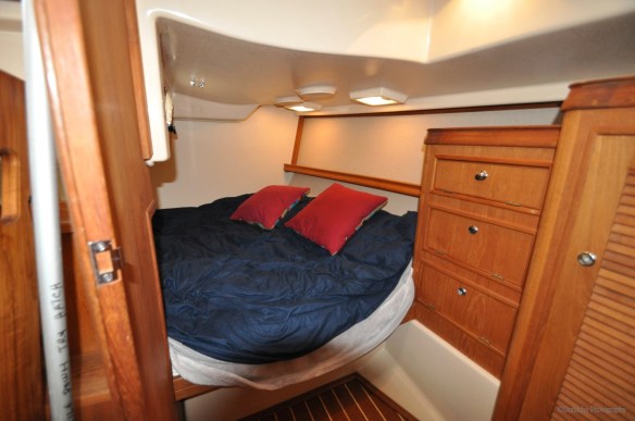 Above: The forward cabin features a comfortable full-size bed, a hanging locker, three cupboards, and additional storage in holds beneath the bed. Below: The aft cabin features another double bed and similar storage.