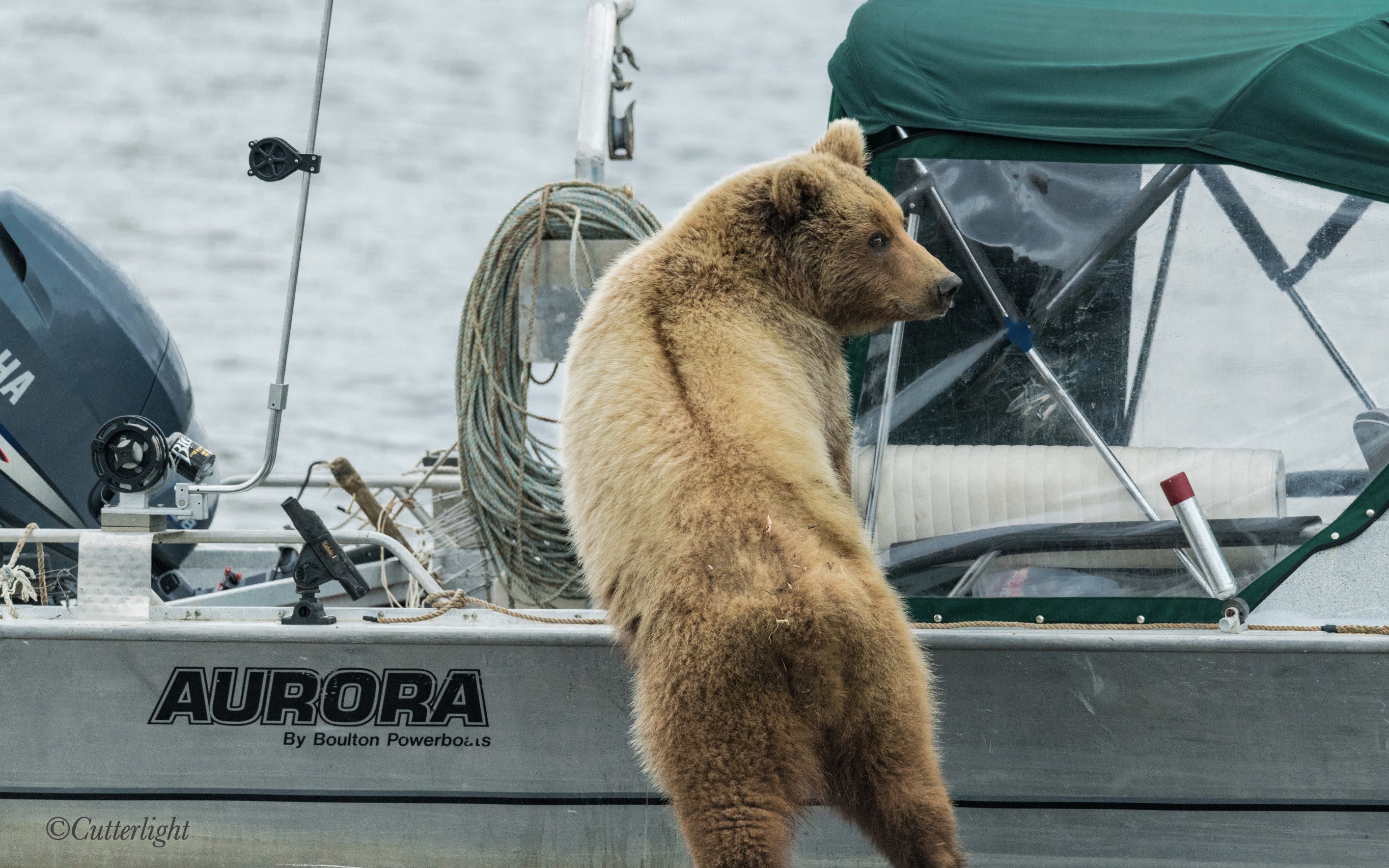Could be checking to see if Kevin left the key in the ignition of this sweet skiff… more likely it was the scent of a recent catch of halibut from the sea a few miles downriver that had this guy’s attention.