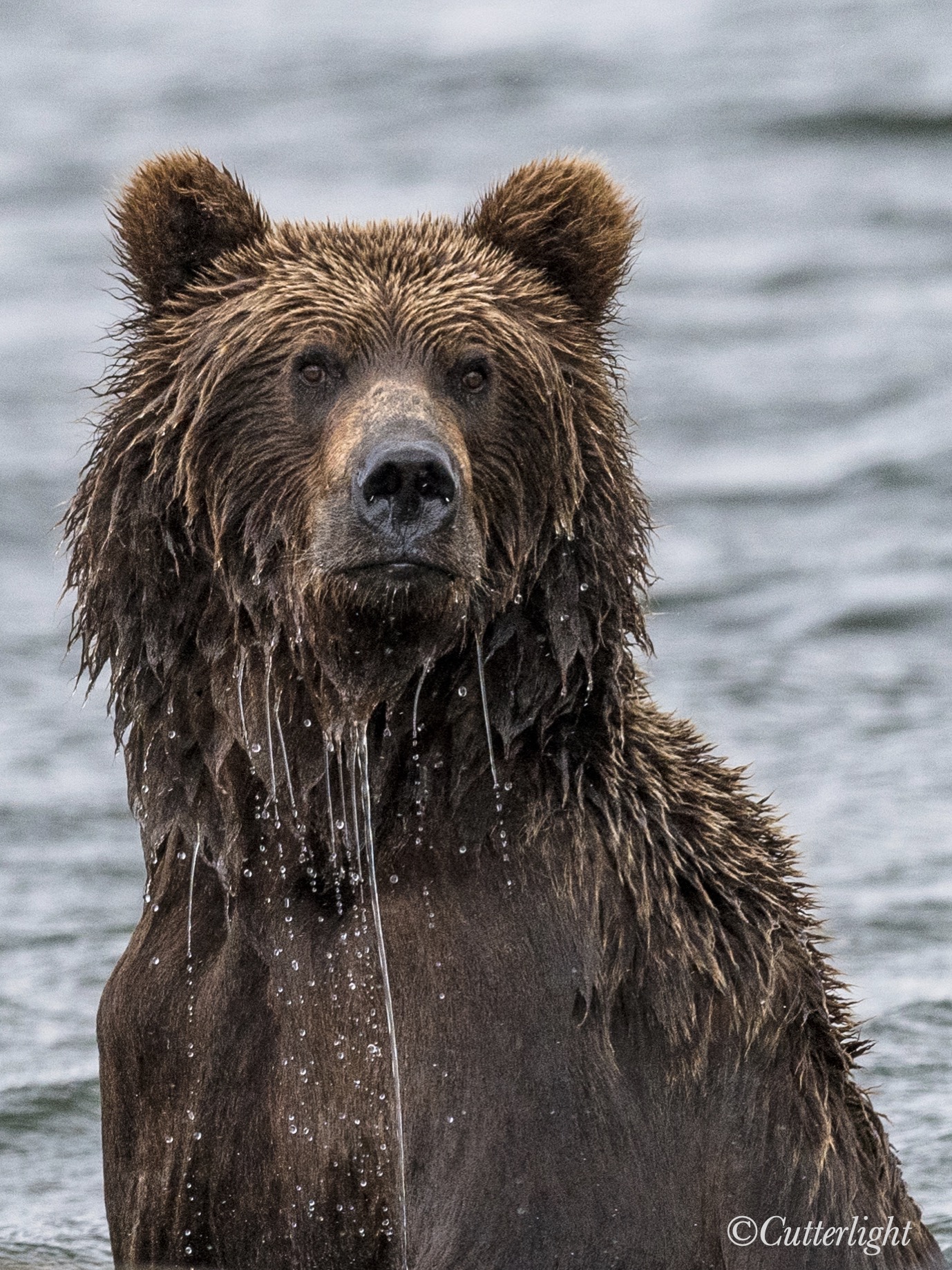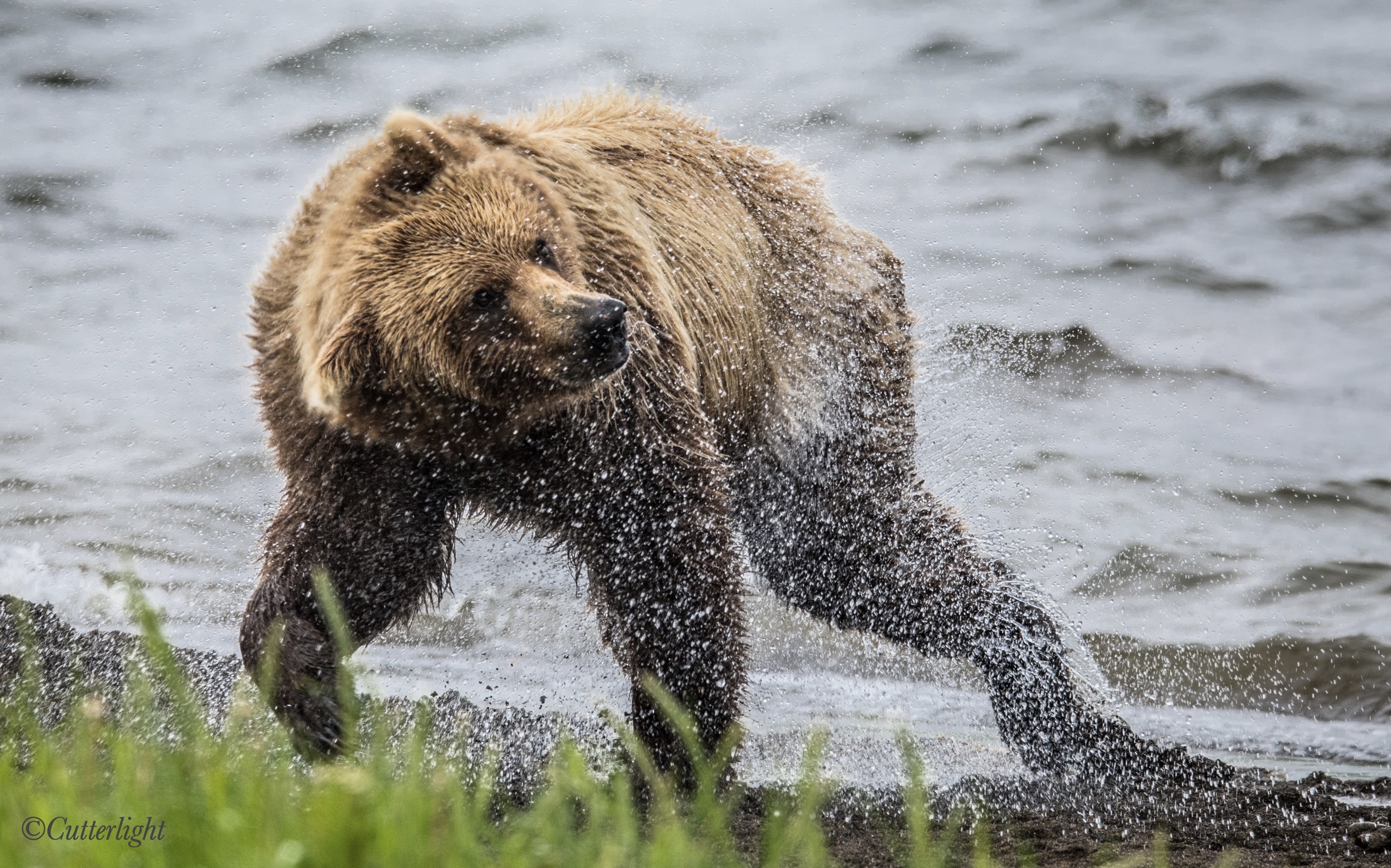 Blondie gives himself a mighty shake after wading the shallows in search of salmon. Still skinny from his winter fast, once the salmon come in he’ll begin putting on serious poundage.