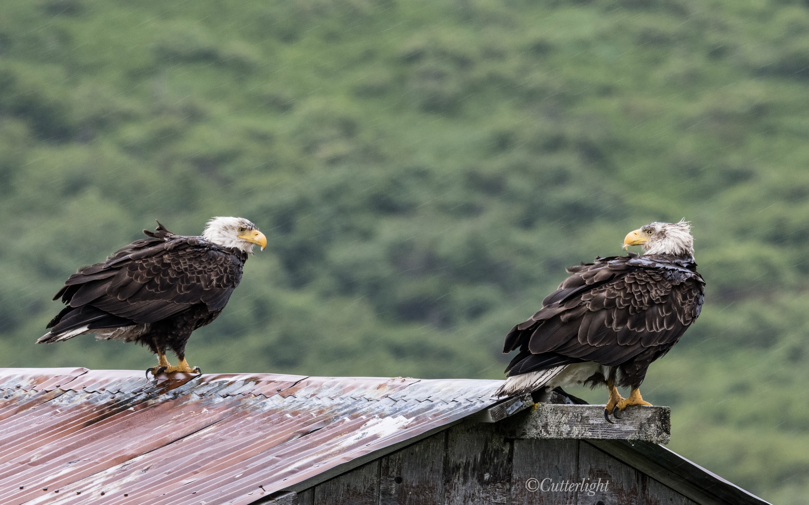 Not yet wearing the startlingly white plumage of fully mature Bald Eagles, these are probably three-year-olds. The tin roof of a lakeside house Sam Stepanoff built – subsequently flooded out by annual high-water events – is a favorite salmon-watching perch for eagles, ravens and gulls.