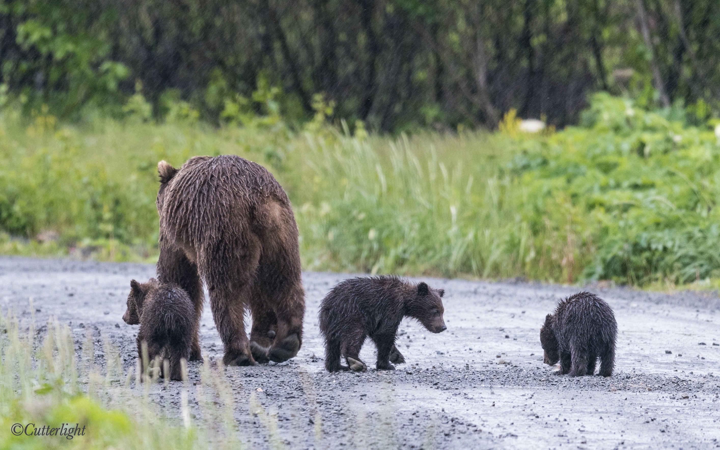 Last night as the sun lingered on past 10 0’clock, then 11 and on toward midnight, it seemed every time we looked out our window there were bears on the beach. First Mom and the triplets, who earlier in the day had surprised us as we were cleaning our skiff. The little ones are still suckling. They waited patiently on the sandy beach, taking turns standing on hind legs in imitation of mom as she scanned the shallows for salmon carcasses, the little guys steadying themselves with small paws pushing on their siblings’ backs.